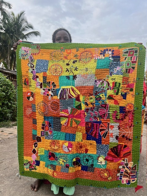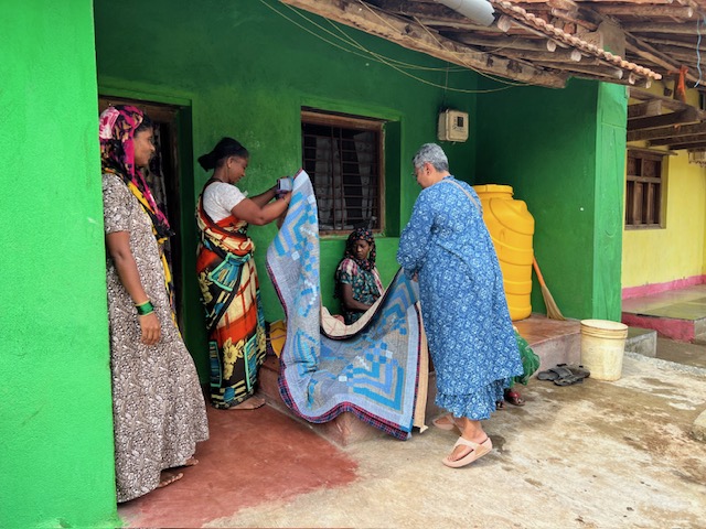During one visit, she spotted a quilt with pieces of fabric arranged in a striking geometric fashion. One particular scrap of fabric looked very familiar and on closer inspection, she realized it was from an old dress of hers that she had passed on for someone in the family to use. It had been upcycled and incorporated in a colorful quilt that had been patched together by a Siddi woman in a neighboring village.