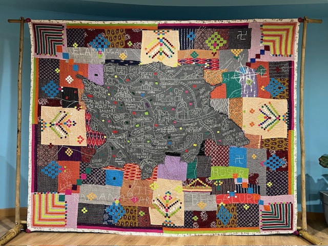 One woman shared – and then embedded in her quilt – the community activity of gathering teak seeds to sell for extra income. From another woman, Anitha was able to draw out her vision of an ideal world for her grandchild. Her quilt featured, among other things, a crab and a dog being walked by two people. It was a simple but beautiful reflection of her aspirations for the unborn child. And then there was the skilled embroidery artist in the group, she said, who added “flowy floral motifs” to her quilts, giving them a unique, distinctive look. She hadn’t shown this work to anyone yet, she said, because she hoped to display it soon at a gallery or art exhibit.